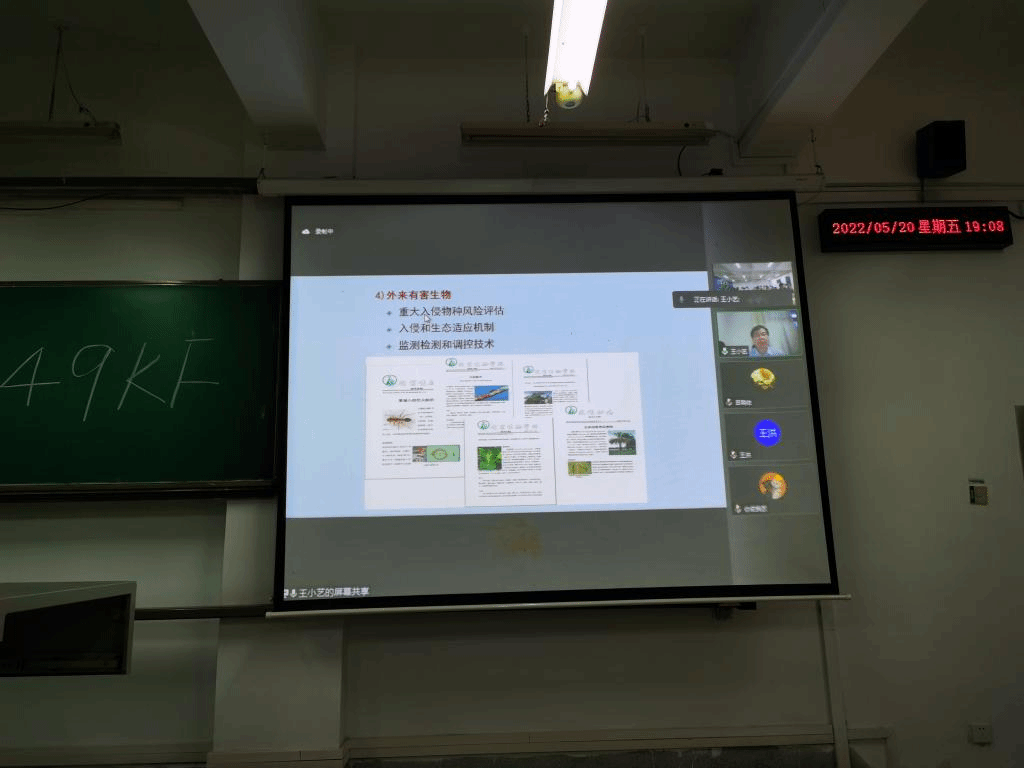 在5月20日晚上进行的讲座中,王小艺研究员作了题为《天敌在林业害虫生物防治上的研究与人工利用》的专场报告,详细介绍了森林生态环境与自然保护研究所科学研究的概况、中国临采有害生物的发生与防治现状、天敌昆虫与林业害虫生物防治研究等内容,特别是围绕典型林业有害生物灾害发生与治理为案例,对天敌生物防治的科学研究案例、前沿趋势、国际合作交流等内容进行了系统阐述,提出的基于天敌生物的有害生物防治中存在的风险收益权衡问题引起同学们的思考。