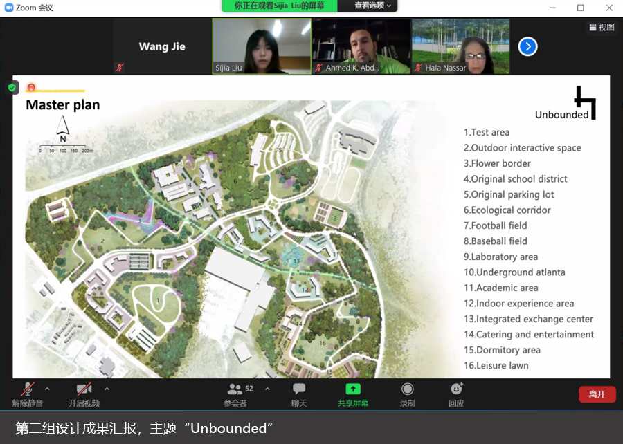 评图嘉宾充分肯定了该组同学的设计成果,Yasser教授表示总体规划方案令他印象深刻,Hala教授建议大家对五大片区的的融合性、交通组织问题以及校园功能空间使用效率提升等内容进一步展开思考。