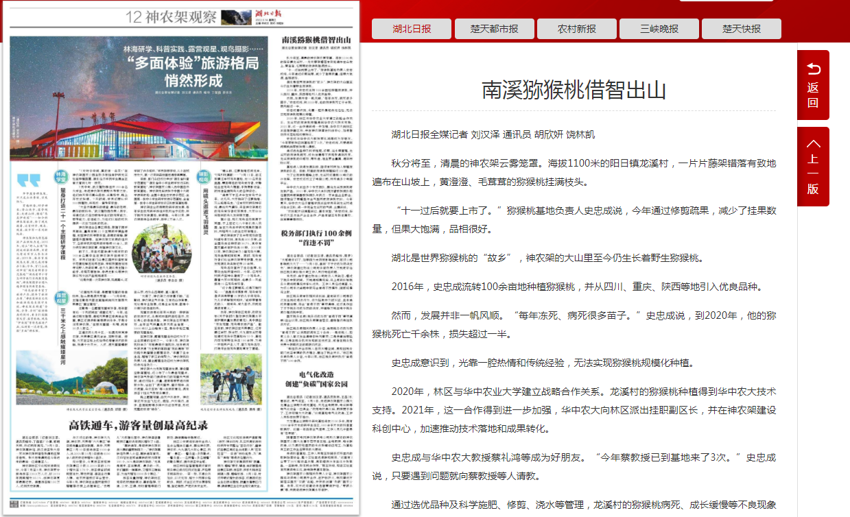 2020年,林区与澳门十大网投正规官网平台建立战略合作关系。龙溪村的猕猴桃种植得到华中农大技术支持。2021年,这一合作得到进一步加强,华中农大向林区派出挂职副区长,并在神农架建设科创中心,加速推动技术落地和成果转化。