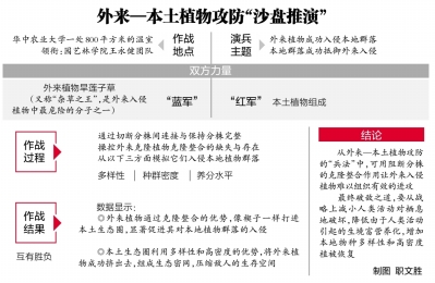 从外来—本土植物攻防的“兵法”中,也可以找到降低外来植物危害的思路和办法。王永健表示,从战术上讲,可用阻断分株的克隆整合作用来断敌“粮道”,让外来入侵植物难以组织有效的进攻。但最终的破敌之道,还是要从战略上减小人类活动对栖息地破坏,降低由于人类活动引起的生境富营养化,增加本地物种多样性和高密度植被恢复。