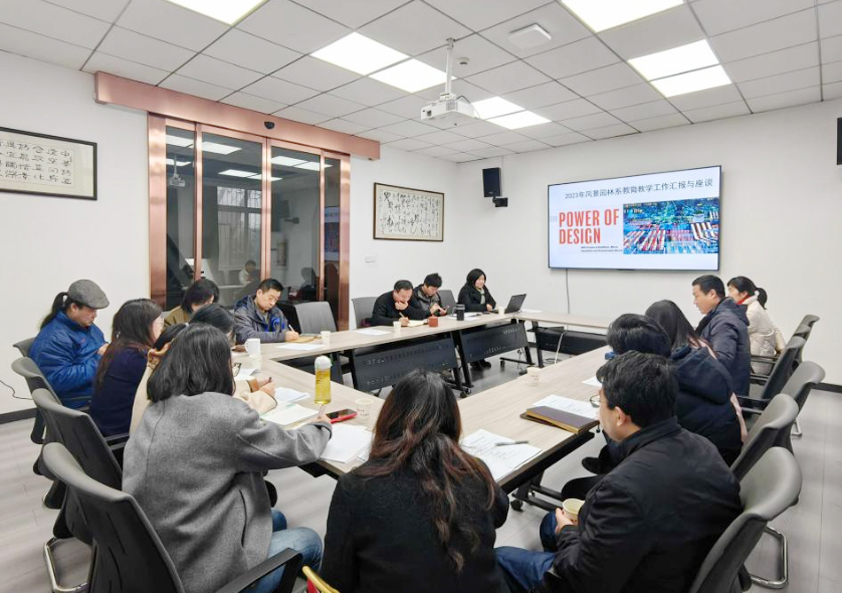 随后,各学科团队负责人及教师代表介绍了各自研究方向的教学目标、思路、建议等方面情况。杨麟副研究员代表的城市逆境植物应用与工程技术团队从课题项目、设备仪器、社会服务等环节审视本科教育教学工作,杨麟谈到“可以充分借助实验室的优势,让同学们在实践教学中了解园林建造工艺,使教学实践环节闭环。”来自风景园林城市更新及气候变化团队的邵继中教授分享了多样化的课程体系,以理论与实践相结合的培养模式为例,介绍了与政府共同缔造的课程案例,使教学与社会服务接轨。以夏海燕老师为代表的山水文化景观风景特质研究团队针对实践教学环节提出成立狮山营造工作室的建议,联合校外专家,以设计营造基地为依托,开展微花园营造邀请赛。以朱春阳教授为代表的城市生态健康诊断与蓝绿空间效能优化团队围绕一流课程,师资队伍,课时安排等问题与大家进行了交流。