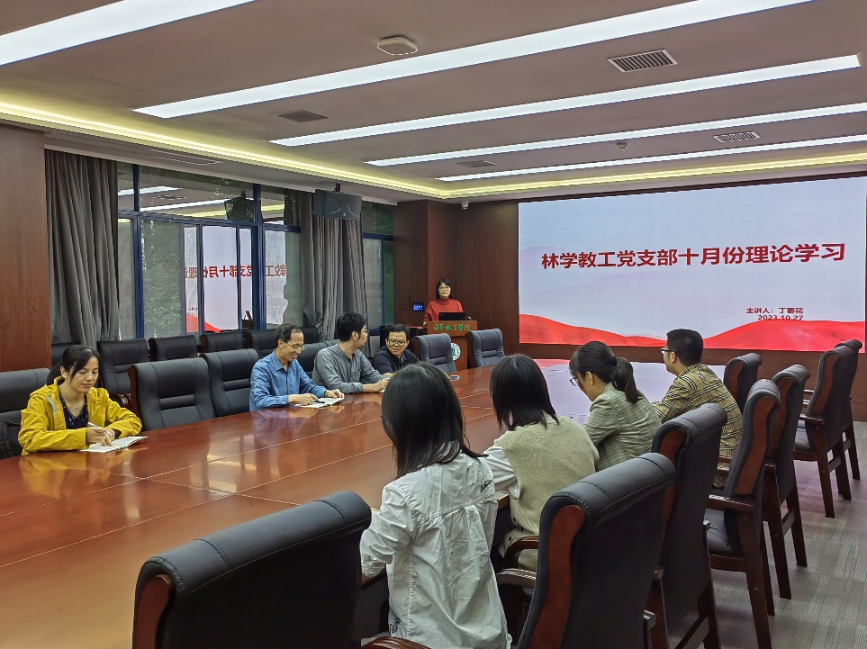 10月27日下午,林学系教工党支部在园林北楼219会议室专题学习习近平总书记关于党的建设的重要思想、习近平文化思想、学校《关于教师党支部在政治把关、师德师风建设中进一步发挥作用的实施办法》《中国共产党党徽党旗条例》等内容。会议由支部书记丁寄花主持并领学。
