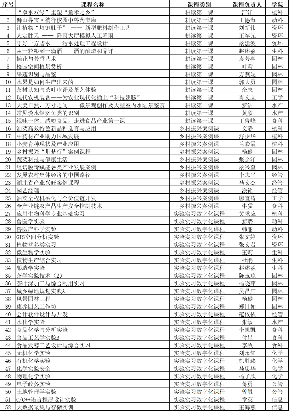 根据《关于开展2023年度耕读教育类课程、虚拟教研室和学生发展指导中心建设的通知》,经团队申报、学院推荐、本科生院组织评审,十大网投正规官网《插花与芳香艺术》、《校园空间植景赏析》、《果蔬识别与品鉴》、《水果是如何生产出来的》、《茶树认知与茶叶审评及茶艺体验》等13个耕读教育类课程建设项目获批立项。详情如下: