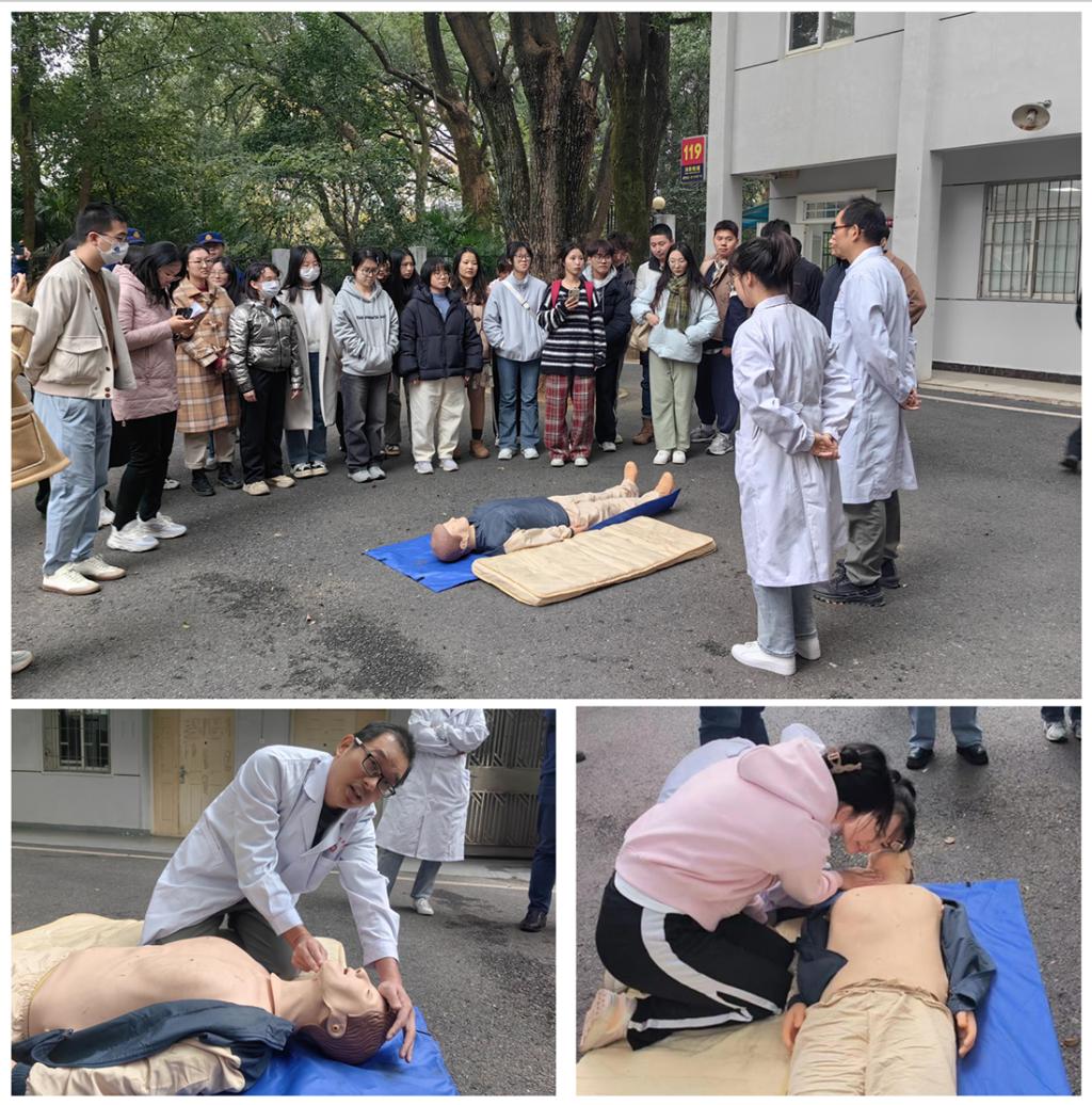 接着,校医院陈医生、李医生向同学们详细介绍了关于心肺复苏术(CPR)和自动体外除颤器(AED)的相关知识,并进行了全流程示范。陈医生提到,“心肺复苏术是我们抢救呼吸、心搏骤停者生命的最基础、最重要的医学方法,如果我们能利用好心搏骤停后的黄金4分钟,采取正确有效的复苏措施,极有可能挽回一条生命。” 随后,陈医生邀请了三位同学体验了肺复苏技术的实操。过程中,校医们进行了耐心的指导。