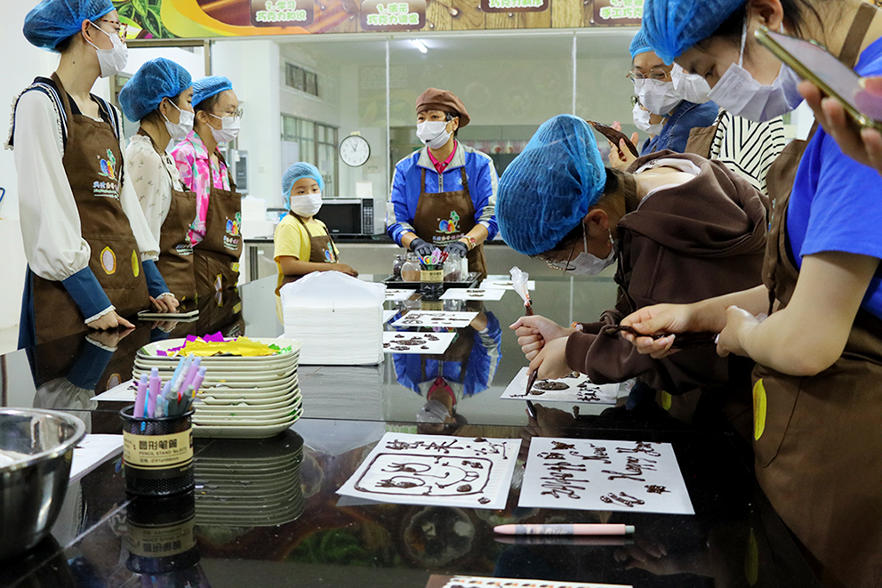 实习的最后一天上午,从事可可遗传育种研究的李付鹏博士为同学们讲解了可可的起源、利用历史以及巧克力生产的现状。据李老师介绍,可可与咖啡、茶并称为世界三大饮料植物,虽然可可现在主要以巧克力的形式出现在人们的生活中,但最初是来源于美洲的一种古老饮料,后来人们将可可粉与可可脂融合制成了风靡全球的巧克力。高脂肪高糖的巧克力在现在被视为不健康的食物,但可可所含的多酚、黄烷醇、生物碱等物质具有心血管保护等康养功效。在学习完理论知识后,同学们前往巧克力制作体验中心体验了手工巧克力的研磨、铸模、冷冻、脱模、包装等工序。