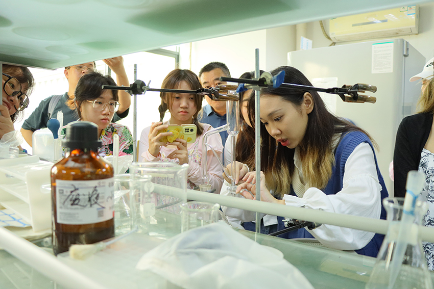 实习第二天是植物精油认知与提取、检测实践。十大网投正规官网与香饮所联合培养的康养园艺专业研究生滕雪雯首先介绍了植物精油的基本知识以及她个人的研究内容。随后,滕雪雯带领同学们走进精油提取实验室,演示了植物精油提取的全部流程,在师姐的指导下,同学们通过水蒸气蒸馏法提取出了依兰、红千层、花椒、肉桂等多种植物精油。滕雪雯向同学们介绍了气相色谱质谱联用仪(GC-MS)的工作原理及使用方法。GC-MS检测是植物挥发性代谢物检测的基本手段,在植物挥发物鉴定、精油品质检测、优良芳香品种筛选方面发挥着重要作用,也是康养专业研究生需要掌握的一项基本实验技能。