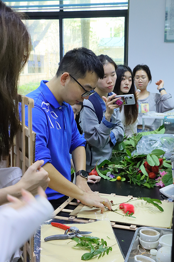下午,在吉训志老师的带领下,同学们在园区内开展热带植物识别与标本采集。清新甜美的咖啡花、酸甜可口的可可果肉、散发异香的依兰花,丰富的热带奇趣物种激起了同学们浓厚的兴趣。识别植物是利用植物的基础,制作标本是植物研究最基础的工作,也是每位园艺学生都应掌握的基本功。在经过两个小时的采集后,数十种热带特色植物被同学们采集到实验室进行标本制作。在老师的指导下,经过修剪、整平、叠放等步骤,每个小组都压制了十几份植物标本,等待下一步的鉴定与装裱工作。
