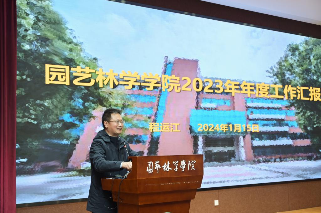 会上,院长程运江作《澳门十大网投正规官网平台2023年度工作报告》。报告指出,学院2023年党的建设不断深化,努力创建党建品牌,其中果树学研究生第六党支部获评湖北省样板党支部并参加全国样板党支部评选;人才培养质量稳步提高,获国家级教学成果二等奖1项,获评国家级一流课程2门,学生就业率稳步提升,学生参与科技创新活动成绩突出;师资队伍建设显著加强,拔尖人才和科研团队培育取得新实效。