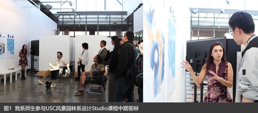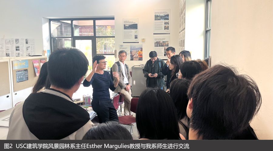当日下午,南加州大学黄国平副教授带领风景园林系师生,前往USC建筑学院参与风景园林研究生设计studio课程中期汇报。USC学生为风景园林系师生介绍了基于洛杉矶火灾重建的竖向设计以及应对气候变化的全球能源利用分析,讲解了其从选题背景、基址调研到聚焦场地的设计思路,两校学生就课程设计进行了广泛交流。而后,USC建筑学院风景园林系主任Esther Margulies教授与我系师生就洛杉矶中心区城市更新进行了交流。