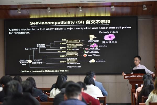 报告中,孙林汉博士详细阐述了以茄科矮牵牛为模式植物的研究过程。研究团队借助功能获得性实验与CRISPR/Cas9突变技术,深入探究调控真双子叶植物自交不亲和基因的功能。同时,运用系统发育和共线性分析方法,追溯这些基因的演化轨迹。尽管茄科矮牵牛的植物自交不亲和机制十分复杂,但整个报告过程内容丰富、涉及的探究进展前沿,现场师生积极互动,学术氛围浓厚。