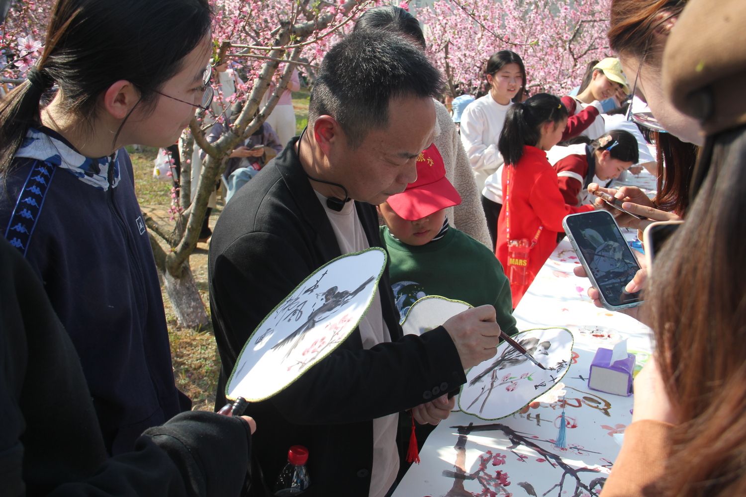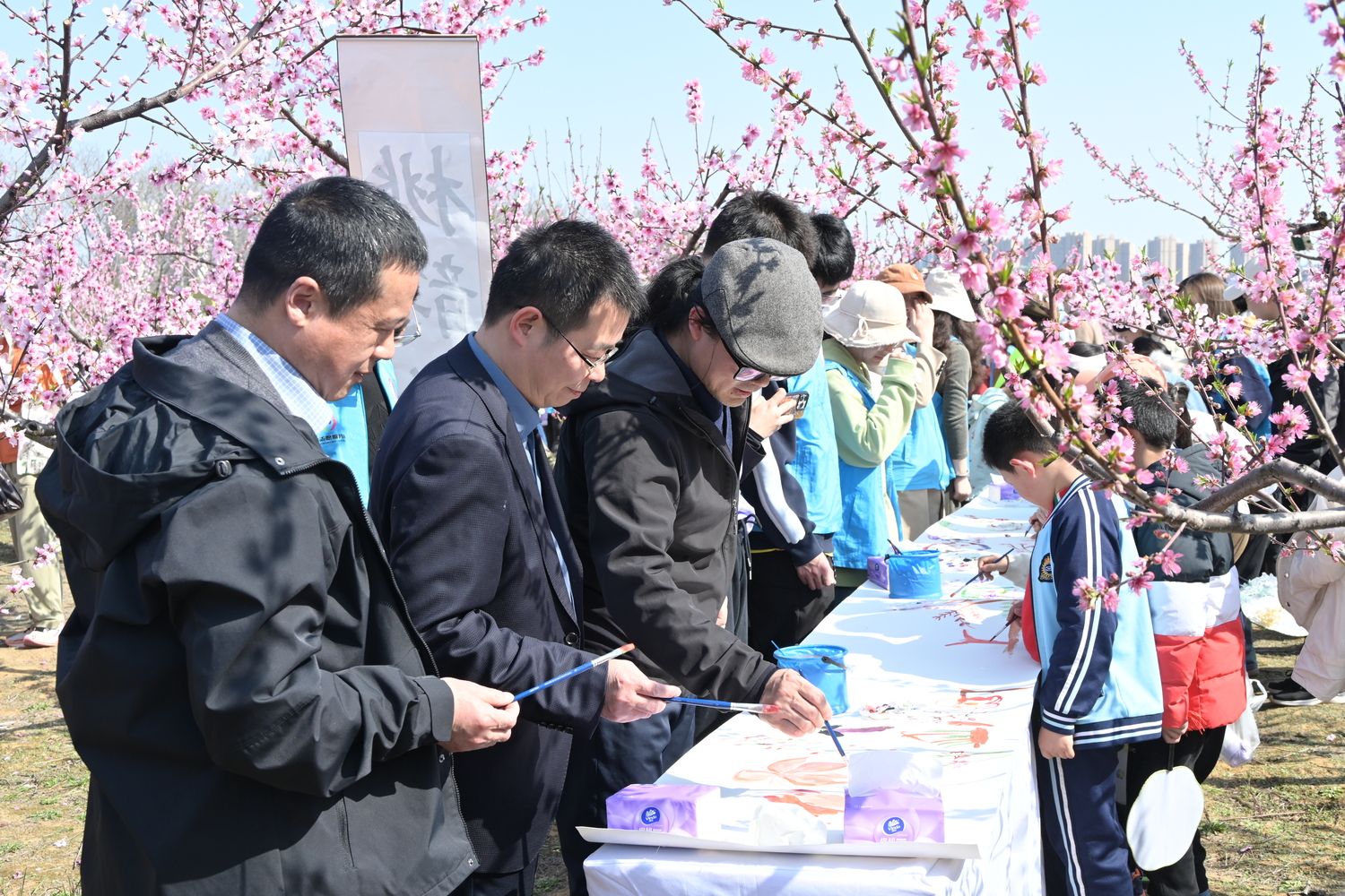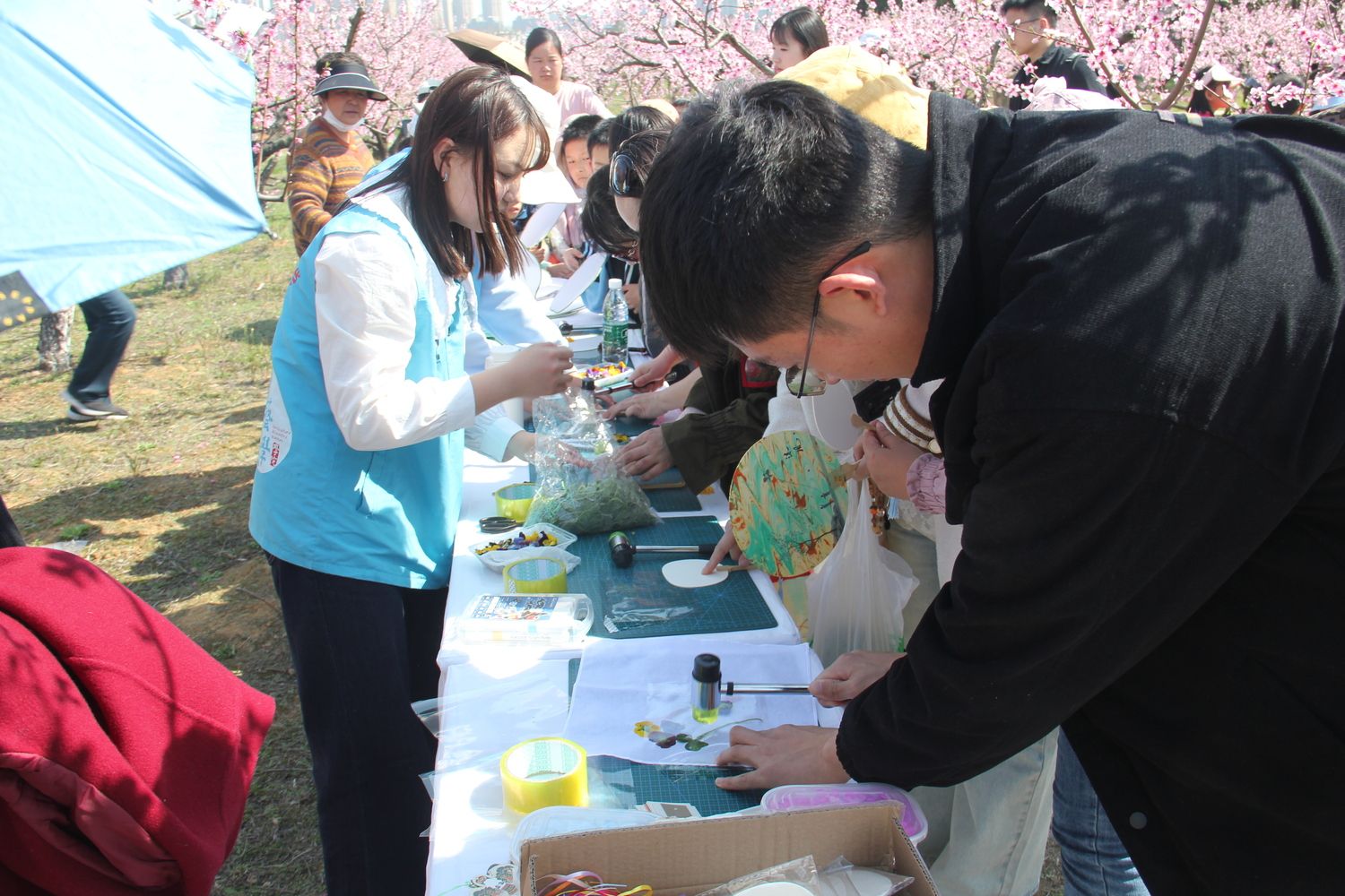 春意盎然的桃林中,“桃花艺术工坊”为游客们准备了一场别开生面的艺术创作体验。“桃韵绘卷”区域,长达10米的素白画卷横卧花海,参与者们执笔挥毫,在水彩与油彩的交融之间定格下桃枝摇曳的春日胜景。澳门十大网投正规官网平台风景园林系秦仁强、洪勇辉老师现场进行创作引导,零基础爱好者亦有机会亲手勾勒心中的桃花源。而在“桃香印笺”体验区,拓印技艺正与艺术文创相互碰撞。参与者们一次次按下蘸染有各色颜料的花瓣模板,宣纸、书签、纸扇上不断绽放出桃花胜景。