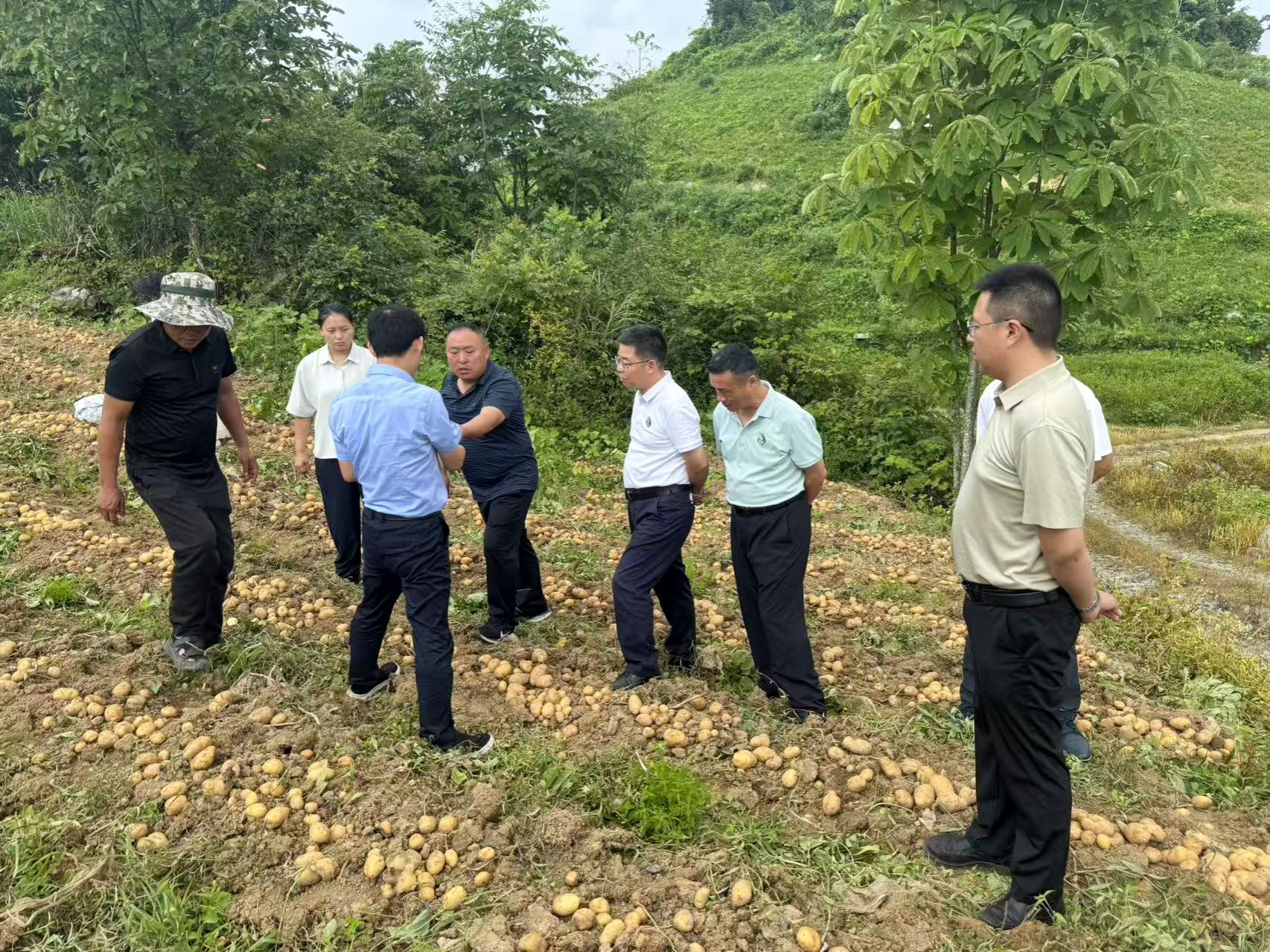 8月5日上午,龙健飞、周继荣一行首先来到湖北百顺农业开发有限公司太平镇洞长湾村马铃薯种植基地。公司负责人向才安介绍,基地依托鹤峰县硒资源优势,重点发展高山蔬菜种植,但在品种改良、病虫害绿色防控等方面存在技术瓶颈。学院蔬菜系聂碧华老师深入田间地头查看马铃薯生长情况,针对相关问题,现场提出相应的技术改良方案,并表示将协助企业建立标准化种植技术规程。