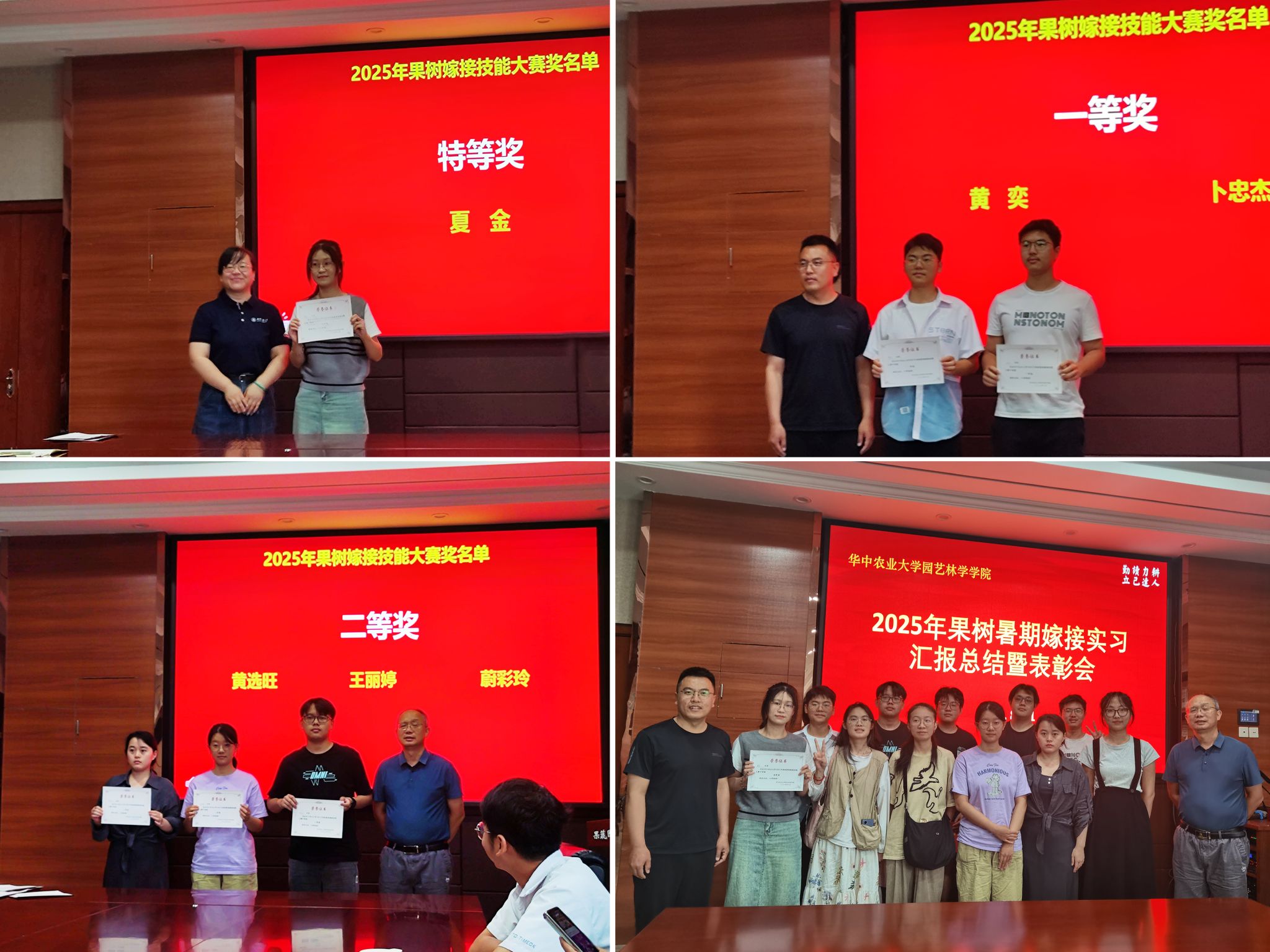 8月31日上午,嫁接教学实习总结暨表彰会在园林南楼206会议室内召开,院主管教学副院长傅小鹏教授应邀出席会议。解凯东老师主持会议,他首先对实习概况进行了介绍,随后由田丹青、黄奕、卜忠杰三位同学分别代表各自小组进行了实习总结汇报。他们通过精心制作的幻灯片和视频,生动再现了老师们在田间地头耐心指导、同学们认真练习的一个个场景,不仅捕捉了技能学习中的点滴进步,更回顾了实习期间收获的宝贵经验与同窗之间真挚的情谊。黄奕还结合自身体会对果树嫁接未来的技术趋势与应用前景提出了自己的思考和展望。值得一提的是,田丹青小组自制了的一段富有创意的剧情短片,将熟练嫁接过程以故事的形式娓娓道来。短片构思新颖,叙事轻松幽默又引人深思,将学习过程中的困惑、坚持与成长融入剧情,不仅生动反映出同学们在实习中的心路历程,更以温暖的方式传递出“真正的神明即是持之以恒的自己”这一深刻主题,赢得了全场师生的热烈共鸣与掌声。小组汇报结束后,傅小鹏副院长和实习指导老师分别为嫁接竞赛获奖同学颁奖,其中夏金同学斩获特等奖,黄奕等同学荣获一等奖,王丽婷等同学获得二等奖,全体同学均通过嫁接实习考核,获得实习结业证书。