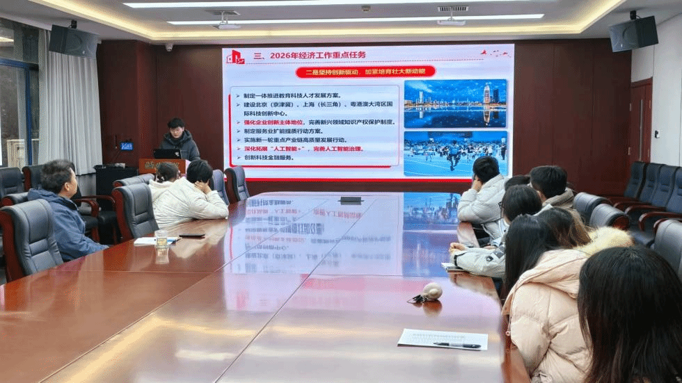 会议伊始,程源同志带领全体党员学习领会中央经济工作会议精神,重点学习了当前经济形势分析、2026年经济工作的总体要求、政策取向以及会议部署的八大重点任务等核心内容。