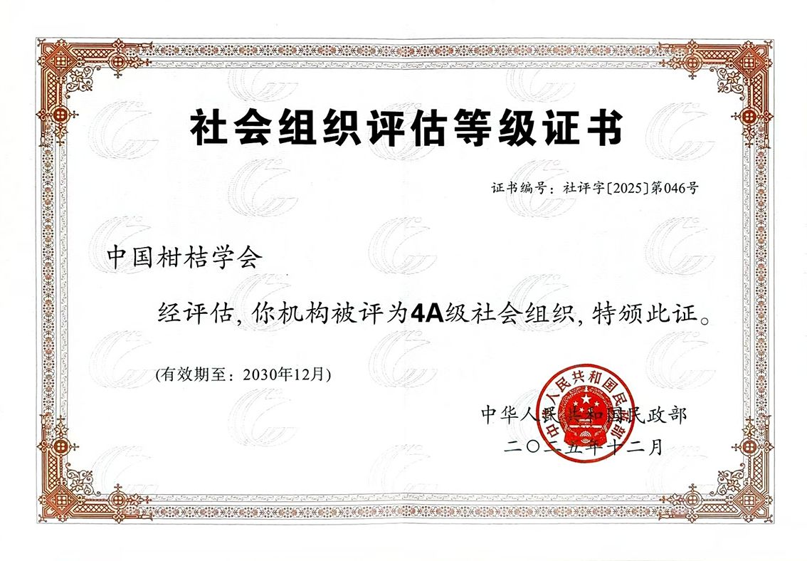 学会理事长程运江介绍,这是该学会首次接受由民政部组织的全国社会组织评估,此次获评国家4A级社会组织,不仅是对学会以往工作的认可,更是对其未来发展的鞭策与激励。学会将以此次评级为新起点,进一步强化自身建设,持续深化行业服务功能,推动柑橘产业技术创新与融合发展,为我国乡村振兴与农业高质量发展贡献更多力量。