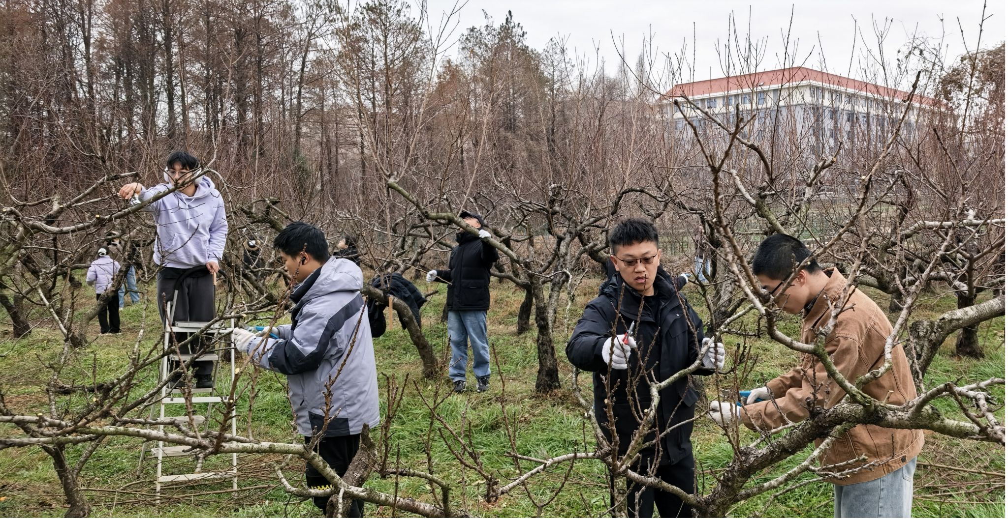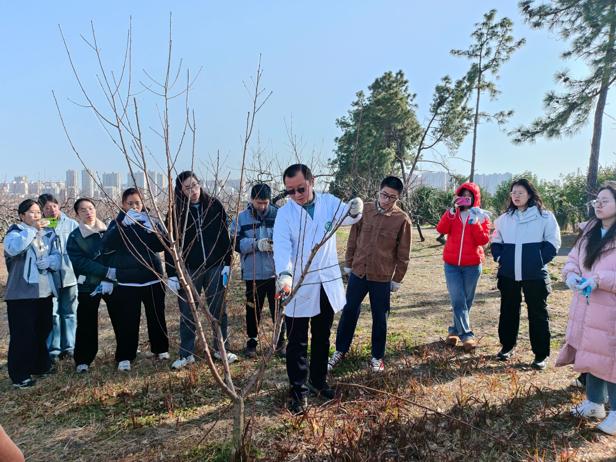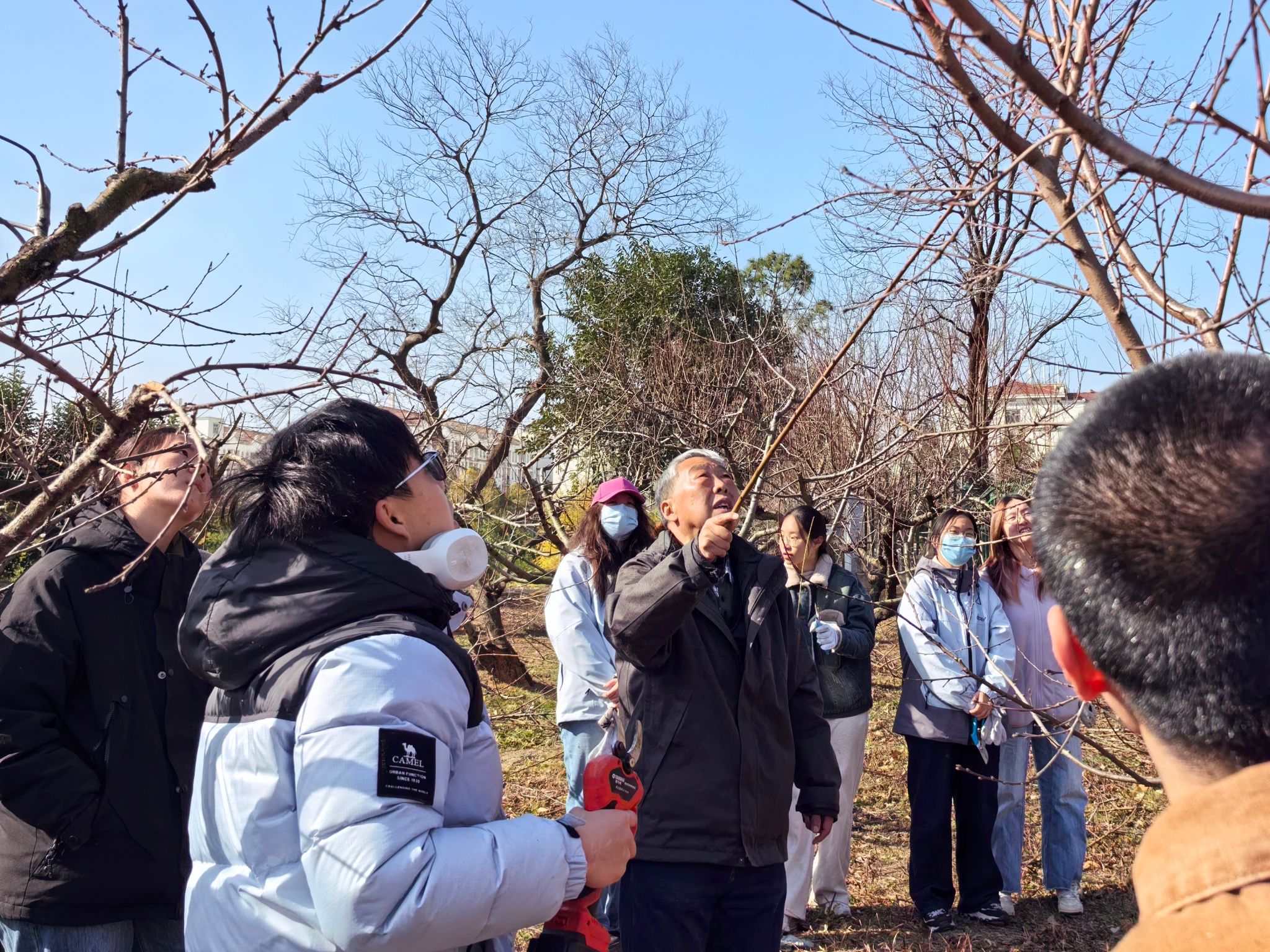 果树冬季修剪实习是园艺专业(果树方向)本科生需要掌握的一项核心技能,是人才培养的关键实践环节,学校、学院和果树系等各级领导和老师历来都非常重视。为保障本次实习顺利进行,学院特地为参加实习的同学们配置了足量的架梯、修枝剪和手/电锯、工作服和手套等实习用品。同学们在果树标本园和花果山两个实习基地,运用短截、回缩等冬剪专业手法,以“方便管理,稳产优质”为目标,完成了桃、梨、葡萄和猕猴桃等落叶果树的修剪。老师们耐心指导每一位同学,逐一指出操作中的优点与不足,同时通过亲身示范与耐心演示,系统讲授从具体修剪手法到整体树形布局的要点。实习期间,校本科教学巡视督导员蔡礼鸿教授来到果园现场为同学们实操了桃树修剪技能。