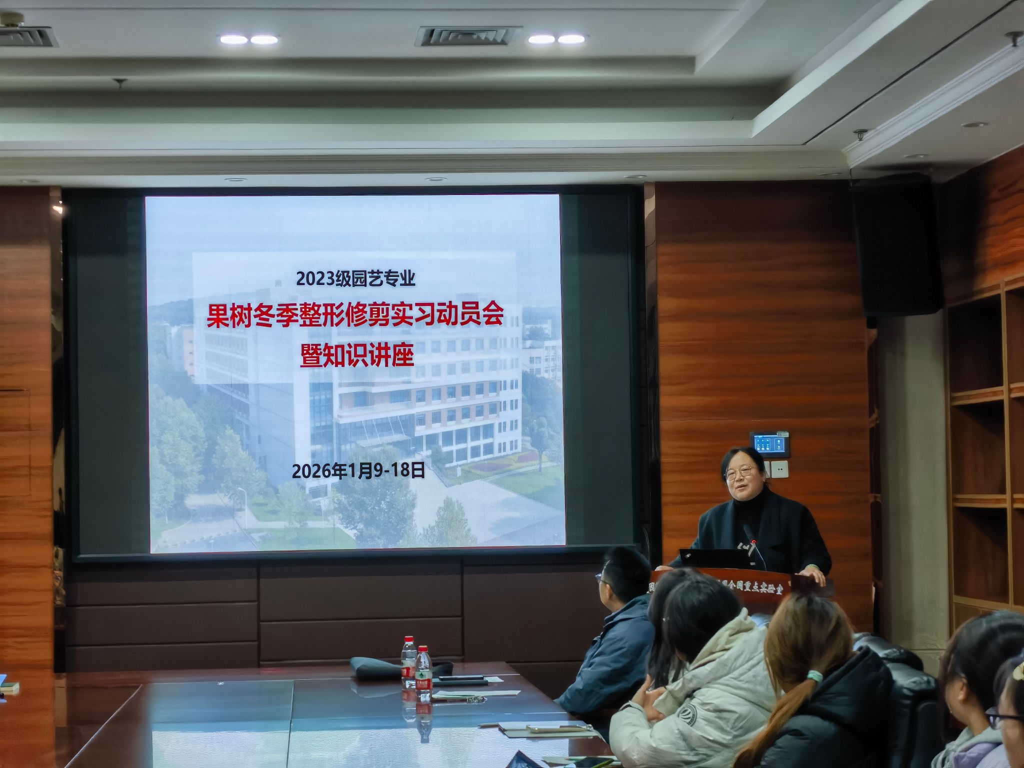 1月9日-18日,2023级园艺专业果树产业技术精英和基础理论精英两个模块共32位同学,进行了为期10天的果树冬季整形修剪实习。1月8日晚,实习动员大会暨理论知识讲座在园林南楼206会议室内召开,会议由果树系朱凯杰老师主持。首先解凯东老师介绍了实习计划和注意事项,接着刘永忠老师详细讲解了修剪理论知识及未来发展趋势。学院教学副院长傅小鹏教授应邀出席会议,她着重强调了实习安全与纪律事项,鼓励同学们勤加练习,掌握核心本领,并为果树未来产业发展贡献力量。
