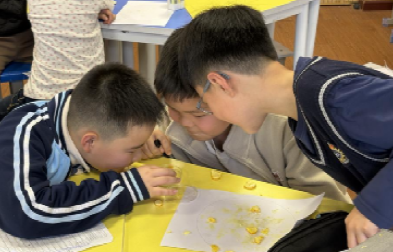 随后,趣味实验环节将课堂氛围推向高潮。在 “油胞小喷泉” 实验中,孩子们认真观察柑橘油胞形态,闻嗅精油香气,记录纸上油点的变化;在“油胞跳舞” 实验里,孩子们将柑橘皮对着水面挤压,看着水面泛起淡淡的油花,好奇地讨论着精油浮在水面的原因。亲手操作,孩子们发现了柑橘精油有香味、易挥发、比水轻的特性,在实践中收获了科学知识,真切体会到科学探索的乐趣。