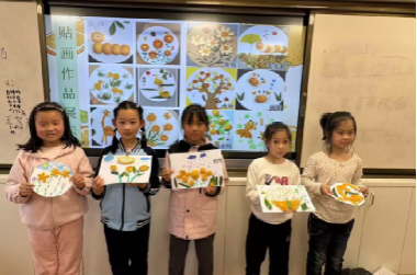 课堂最后,创意橘皮贴画制作环节温馨开启。在了解制作步骤和注意事项后,孩子们迫不及待地动手创作:先在卡纸上勾勒底稿,再小心翼翼修剪橘皮和橘叶,将剪好的材料仔细粘贴,用彩笔为贴画补上精致细节。小花、橘子树、螃蟹、毛毛虫…… 一个个充满童趣的图案在孩子们的巧手下逐渐成型。 贴画完成后,老师对作品进行了展示点评,肯定每位孩子的用心创作,对精巧的作品予以称赞,对稚嫩的作品给出改进建议。孩子们看着自己的作品被展示,脸上洋溢着自豪的笑容,还互相交流着制作心得,教室里满是欢乐的氛围。