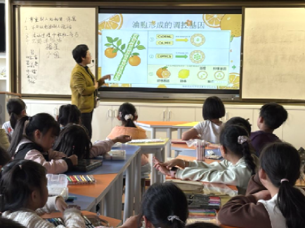 课堂伊始,老师以 “柑橘皮上的小点点是什么” 为问题导入,瞬间吸引了孩子们的注意力。通过生动的讲解,孩子们系统认识了柑橘油胞,了解到油胞的特征结构,形成过程和作用等。徐老师还借助卡通图片,向大家讲述了科学家揭秘柑橘油胞形成和调控的基因奥秘,启发大家善于发现生活中的科学问题,在掌握知识本领后主动探寻现象背后的科学本质。