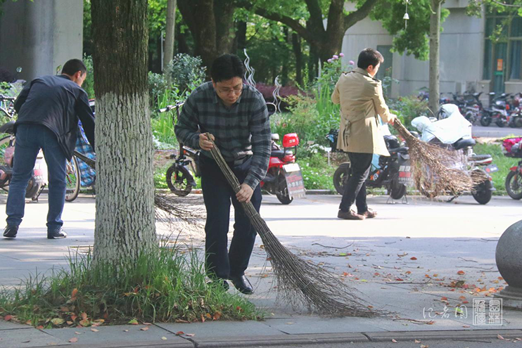 4月23日下午,十大网投正规官网师生在园林北楼和景园楼附近进行校园环境卫生义务劳动。院党委副书记蔡江等教师和二十余名学生参与本次活动。
