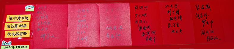 为表达对母校的热爱、教育后辈,校友们捐赠了聚会签名册,李鸿模校友向学校捐赠了字画作品、《李鸿模山水画作品选集》和《果树栽培技术手册》,周捷可校友向学校捐赠了字画和著作《北京花卉》;陈忠福校友向学校捐赠了珍藏多年的章文才先生为其著作《实用柑桔栽培技术》序言手稿和《实用柑桔栽培技术》。胡汉苹、孙景瑛等校友捐出自己诗词书法作品和奖励证书等。