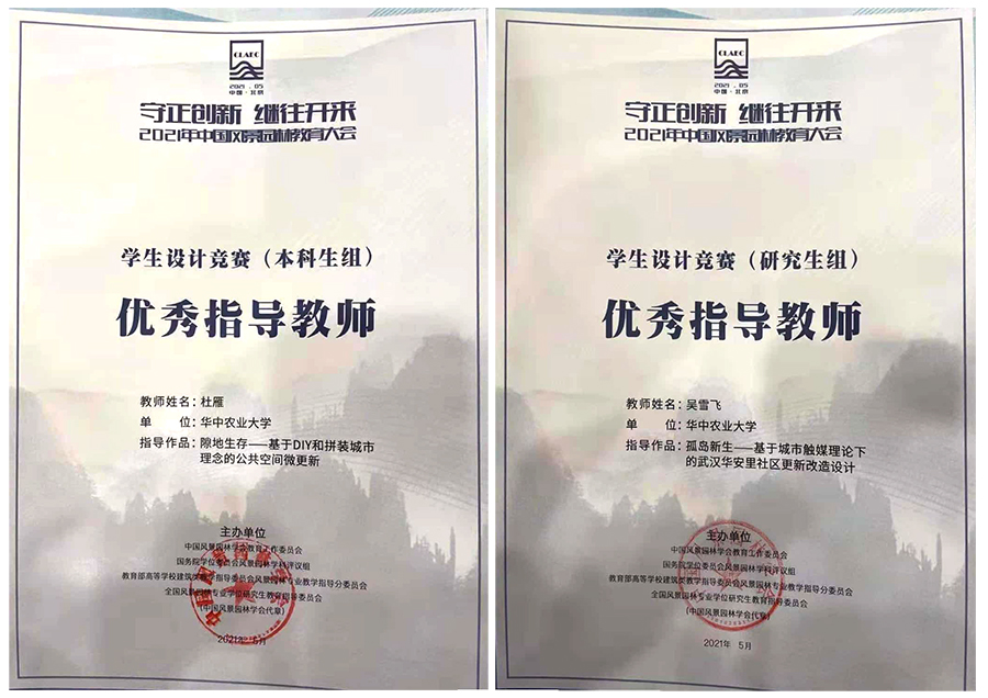 在以“风景园林与城市更新”为主题的2021年中国风景园林教育大会风景园林设计竞赛中,风景园林研究生参赛团队与本科生参赛团队均荣获三等奖。指导教师吴雪飞、杜雁分别荣获研究生组、本科生组优秀指导教师。
