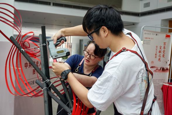 本期的“一书一花一世界”花艺创作相比于之前的《论语》、《热爱生命》、《人类群星闪耀时》尺寸更大,同时难度也升级,王媛媛老师、张蔚老师和郑日如老师带领研究生杨雪、黄精华、沈心彦提前一天进行主体架构的搭建。