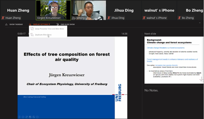 弗莱堡大学的Jürgen Kreuzwieser教授介绍了银冷杉与山毛榉的混交模式影响森林生物挥发性有机化合物的排放,并影响林分的能量平衡和空气质量,进而影响区域气候,为利用森林生态系统应对全球气候变化提供了重要思路。