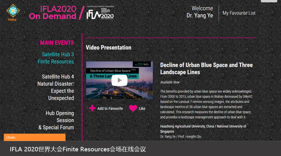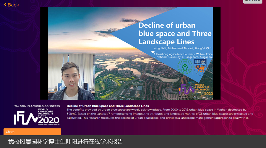 澳门十大网投正规官网平台和新加坡国立大学联合培养博士生叶阳受邀参会,并在21日的“有限资源”(Finite Resources)会场中在线进行了题为《Decline of Urban Blue Space and Three Landscape Lines》的学术报告。研究测量了武汉市蓝色空间的衰退、提供了一种景观管理的应对方法,并提出风景园林规划设计应该维持有限的城市蓝色空间,以改善未来的生活条件和环境。报告引发了在线代表们的广泛讨论。该研究系我校裘鸿菲教授主持的国家自然科学基金面上项目(31770753)的阶段性成果,新加坡国立大学的Nawaz博士对本次报告提供了建议。