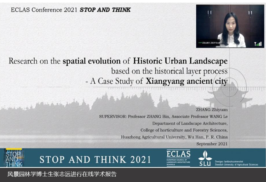 2021年9月13-15日,由欧洲风景园林高校理事会(ECLAS–“European Conference of Landscape Architecture Schools”)主办的“ECLAS Conference 2021 Online”在线召开。本次大会主题为“STOP AND THINK”,设有9个分论坛,包括Climate Change and Adaptation、Cultural Landscape、Design History, Theory and Methods、Education and Pedagogy、Green Landscapes and Living、Our Field and Profession、Societal Context、Urban and Rural、Independent Sessions。澳门十大网投正规官网平台风景园林学博士生张志远、刘思雨受邀参会,分别参加了13日的学术报告以及15日的博士生论坛。