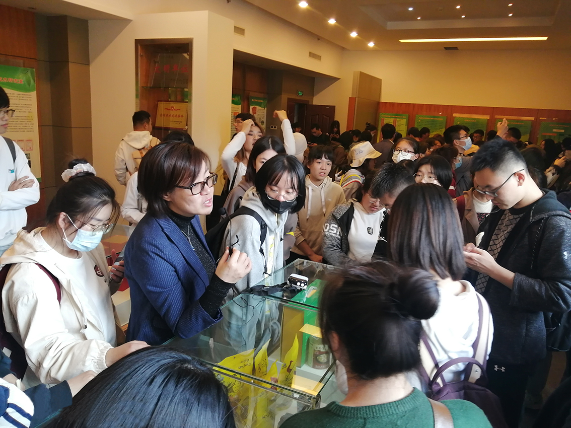 活动中吸引眼球的还有辐照中心的农产品加工研发展示区。在展馆里陈列了多项辐照中心所生产加工出的产品,如:虫草酒、山药原粉等。中心的老师也详细向同学们介绍了多种农产品加工研发的历程与工序,例如:水生蔬菜加工、淡水鱼类加工、畜禽与水产加工等。根据近几年的研究成果,辐照加工技术逐渐受到重视,中心也开发了辐照变性淀粉、高吸水性魔芋辐照接枝材料等。同时,中心的老师着重提到了辐照技术在功能食品中的研究技术与应用。为了契合市场需求,辐照中心对很多产品都进行了功能成分的改良与创制。
