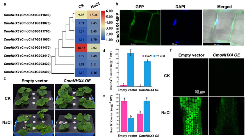 该研究采用农杆菌侵染带有生长点的外植体,首先建立了一种适宜葫芦科作物的发根体系,在南瓜中的效率可以达到84%,该体系同样适用于黄瓜、甜瓜、丝瓜和葫芦等葫芦科作物(图1)。另外,研究者还将发根体系的方法与嫁接方法进行了组合,可以在发根的同时进行嫁接,以实现对砧木的遗传改造(图2)。进一步,该研究在黄瓜/南瓜嫁接复合体中对CmoHKT1;1进行了基因编辑,相关机制研究表明CmoHKT1;1通过限制Na+的长距离运输参与南瓜砧木提高黄瓜接穗的耐盐性(图3)。另外,将南瓜Na+/H+逆向转运蛋白CmoNHX4超表达在黄瓜根系中能显著提高黄瓜的耐盐性(图4)。该发根体系同样适用于在根系细胞中进行亚细胞定位和对根系进行荧光染料染色观察等细胞生物学实验(图4)。以上研究建立了适合葫芦科不同嫁接组合的根系瞬时转化系统,并将其成功应用于瓜类耐盐基因的功能验证,为研究葫芦科作物根系基因功能及砧穗互作提供了一种有效方法。