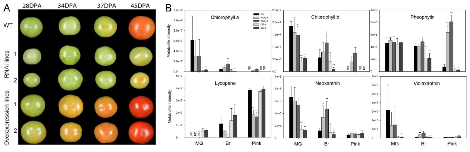 图二 SlWD40转基因果实成熟进程及色素含量差异