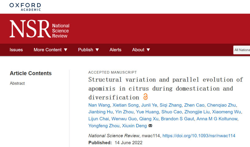 2022年6月14日,澳门十大网投正规官网平台园艺植物生物学教育部重点实验室邓秀新院士团队在National Science Review上发表了题为“Structural variation and parallel evolution of apomixis in citrus during domestication and diversification”的研究论文。该研究首次揭示了柑橘中不同属间无融合生殖性状存在平行进化,回答了现代栽培柑橘广泛存在无融合生殖的遗传机制。