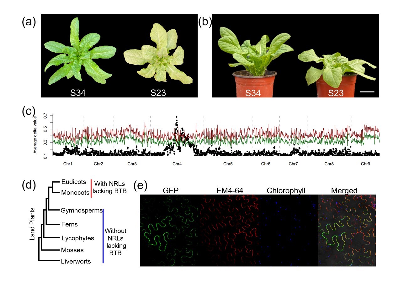 作者通过“白”莴笋S23与深绿莴笋S34杂交获得遗传分离群体(图1a-b)。遗传分析显示叶绿色深浅和叶夹角大小由一个位点控制(图1c)。精细定位发现白莴笋中发生了大片段丢失,丢失的区域包含一个NRL家族成员,LsNRL4。它是NRL家族中的一个特殊成员,其编码的蛋白相比于其他NRL家族成员缺失了一个重要的BTB结构域。NRL4及其直系同源基因广泛分布在被子植物中(图1d),LsNRL4蛋白定位于细胞膜(图1e),但其功能仍不清楚。