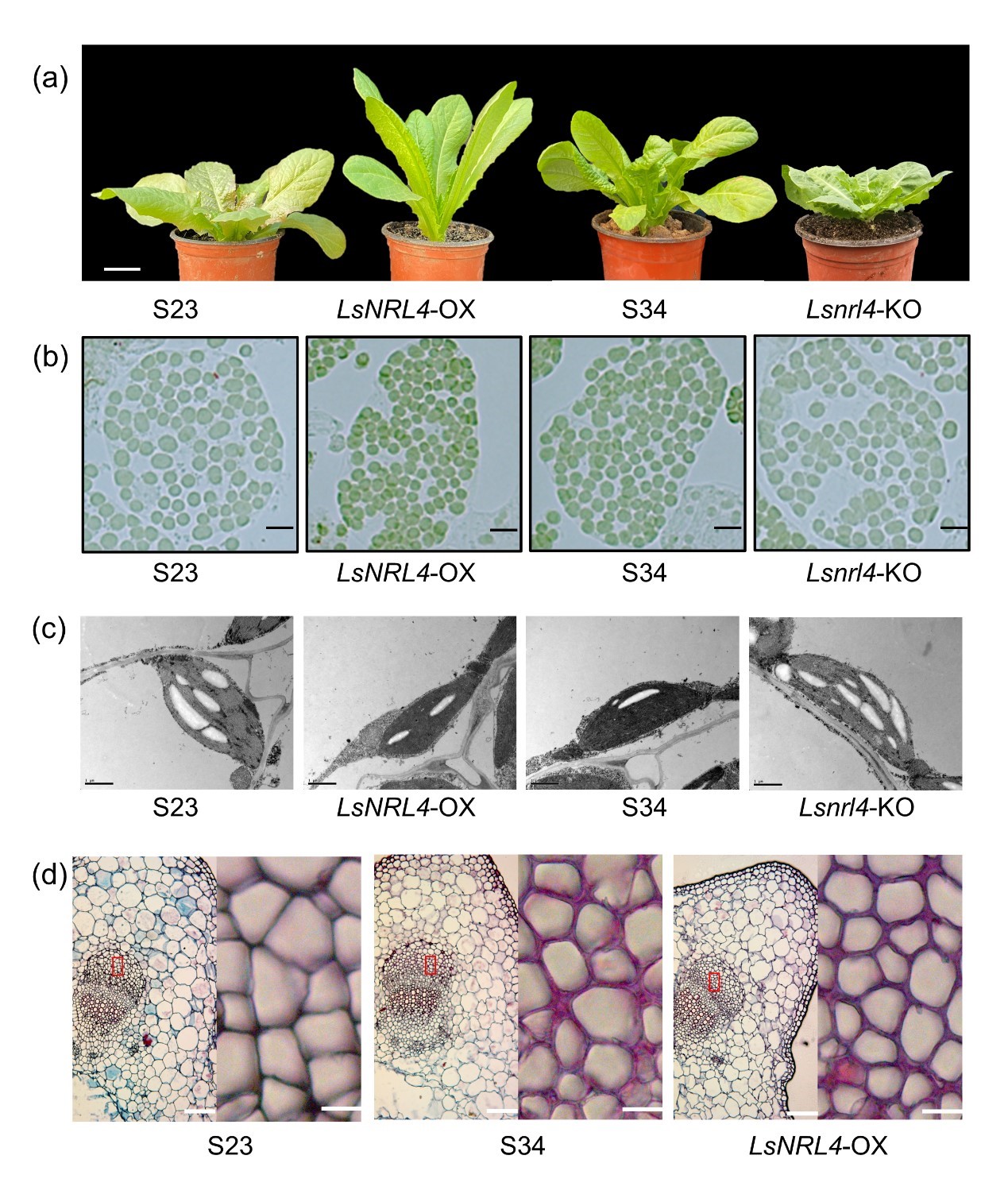 图2. LsNRL4基因通过调控叶绿体和维管束厚壁细胞的发育来参与莴苣的光合作用和株型建成(叶夹角)。