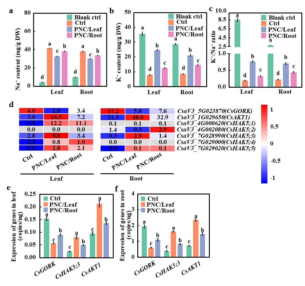 图2CeO2NPs对黄瓜幼苗Na+/K+含量及K+转运相关基因表达量的影响