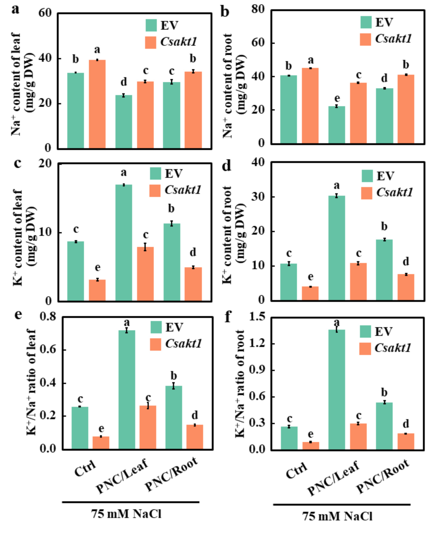 图5根系敲除CsAKT1对盐胁迫下施用CeO2NPs后黄瓜Na+和K+含量的影响
