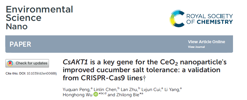 近日,澳门十大网投正规官网平台园艺植物生物学教育部重点实验室、澳门十大网投正规官网平台别之龙教授课题组与植物科学技术学院吴洪洪教授合作在CeO2纳米材料提高黄瓜耐盐性的机制方面的研究成果以“CsAKT1is a key gene for CeO2nanoparticles improved cucumber salt tolerance: a validation from CRISPR-Cas9 lines”为题发表于Environmental Science: Nano。