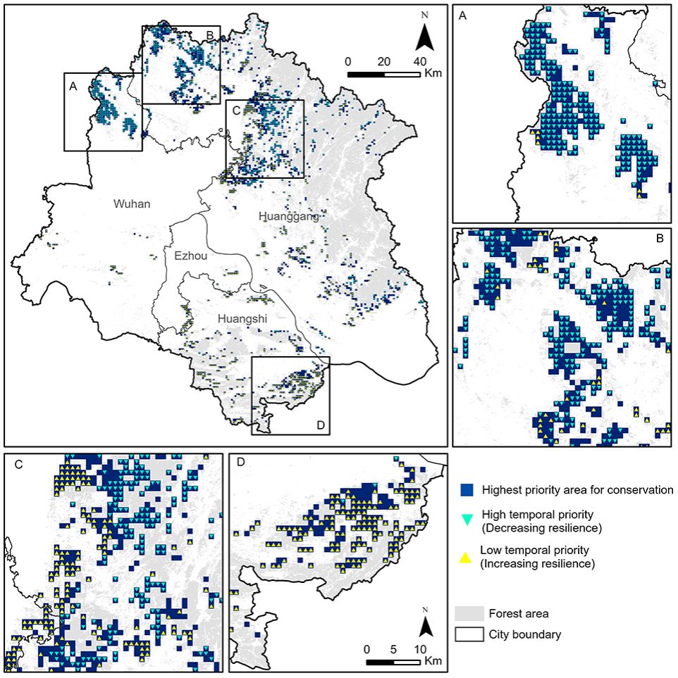 将前30%优先保护区与森林韧性时间变化的空间分布叠加后显示,有803个单元(约631.2 km²森林覆盖)韧性下降,表明亟需干预;849个单元(约591.2 km²森林覆盖)韧性上升,表明干预的时间优先级较低。图3中标记的A、B、C、D区域分别对应四个主要优先聚集区:武汉北部、黄冈西北部、黄冈中部和黄石东南部。其中,A区和B区森林主要表现为韧性下降,C区韧性增减大致均衡,D区则以韧性上升为主。这些结果表明,纳入韧性时间趋势分析能够为保护决策提供更加精准且动态的信息。