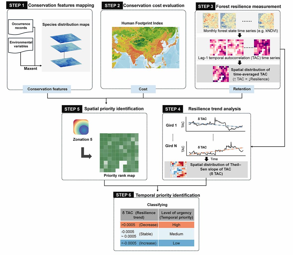 该方案包含六个步骤(图1):(i)保护特征制图——选取代表性物种并用Maxent模型模拟其空间分布;(ii)保护成本评估——以人类足迹指数(HFI)作为保护的机会成本代理指标;(iii)森林韧性量化——基于植被状态(核化归一化植被指数 kNDVI)时间序列计算一阶时间滞后自相关(lag-1 TAC)作为临界慢化(CSD)指标,并对所有时间单元的负TAC值取均值得到平均韧性;(iv)韧性趋势分析——用Theil-Sen斜率估计器计算整个时间序列上TAC的线性趋势以评估长期轨迹;(v)空间优先区识别——使用Zonation将保护特征、成本与韧性综合确定优先区域;(vi)时间优先级判定——以长期韧性趋势表征系统崩溃风险,从而确定干预的时间紧迫度。