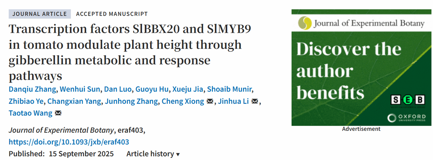 近日,澳门十大网投正规官网平台、果蔬园艺作物种质创新与利用全国重点实验室王涛涛课题组在Journal of Experimental Botany 在线发表了题为“Transcription factors SlBBX20 and SlMYB9 in tomato modulate plant height through gibberellin metabolic and response pathways”的研究论文。该研究揭示了一个调控番茄株高的新模型——SlBBX20和SlMYB9通过维持GA代谢和响应途径之间的平衡来共同调节番茄植株高度。