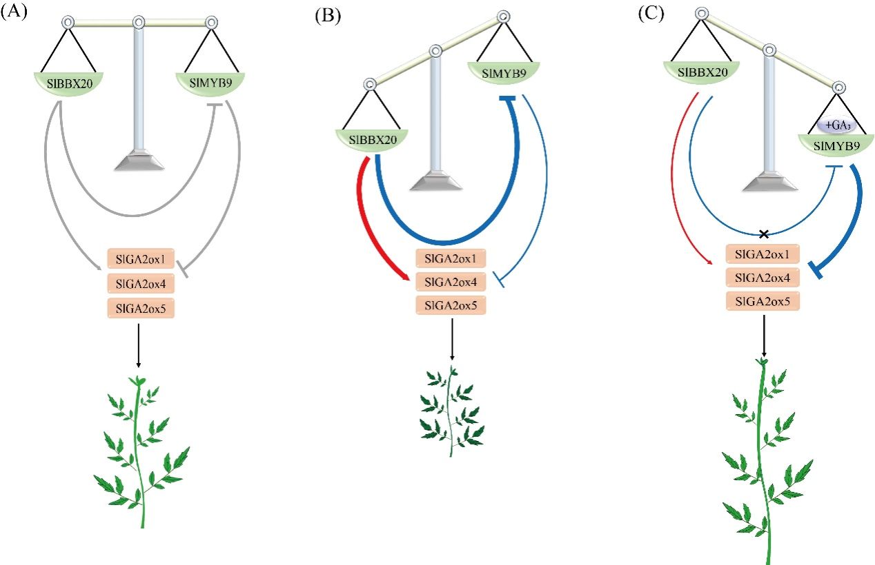 该研究发现转录因子SlBBX20负调控番茄植株高度,SlBBX20超量表达导致植株矮化,内源赤霉素含量变低,且外源喷施赤霉素可恢复超量株系的植株高度。通过RNA-seq数据发现SlBBX20可以直接结合到一个新的赤霉素响应基因SlMYB9的启动子上并抑制其表达,同时SlBBX20可以直接结合赤霉素代谢氧化酶基因SlGA2ox1、SlGA2ox4和SlGA2ox5的启动子上并激活它们的表达,导致矮化的表型。进一步通过对SlMYB9转基因功能检验发现SlMYB9在响应赤霉素后抑制SlGA2ox1、SlGA2ox4和SlGA2ox5的表达,并且不再受SlBBX20的抑制,遗传学验证也得到同样的结果,即在SlBBX20超量株系中恢复SlMYB9的表达可以恢复其植株高度。该研究揭示了SlBBX20-SlMYB9-SlGA2ox模块通过协同调控GA代谢与信号通路调控番茄株高的新机制,为植物株型育种提供了重要靶点和理论依据。
