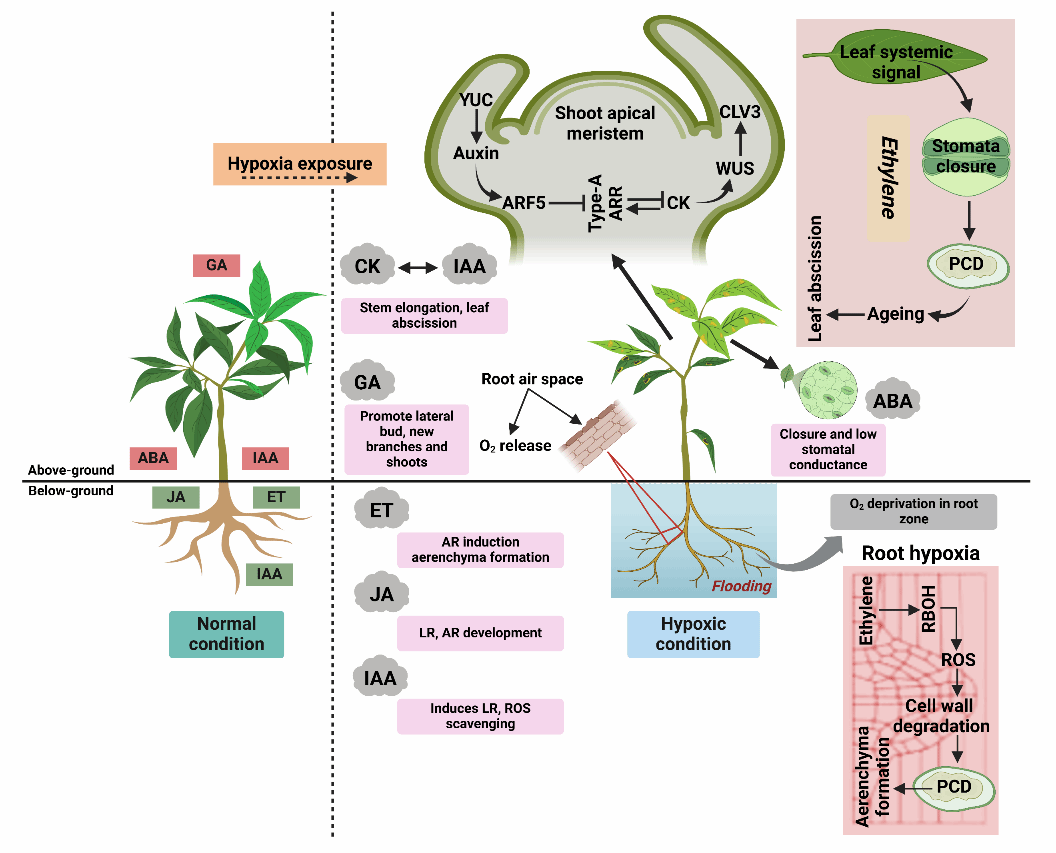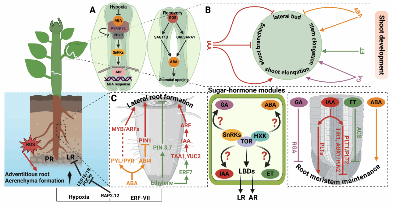 本综述的核心亮点在于系统性地提出了以乙烯为信号枢纽的激素互作网络模型,该网络贯穿于低氧感知、信号转导直至器官适应性建成的全过程。
