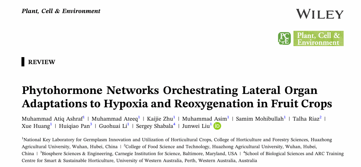 随着全球极端气候事件频发,水涝胁迫已成为制约果树产业可持续发展的关键非生物逆境之一。与一年生作物不同,果树作为多年生木本植物,器官受损后恢复缓慢,且水淹过程中伴随的“低氧-复氧”循环会引发更为复杂的次生损伤。近日,澳门十大网投正规官网平台桃栽培生理与生态课题组在植物学领域知名期刊Plant, Cell & Environment上在线发表了题为“Phytohormone networks orchestrating lateral organ adaptations to hypoxia and reoxygenation in fruit crops”的综述论文。该文系统阐述了果树在低氧及复氧过程中,如何通过激素互作网络精密调控侧生器官(如不定根、通气组织、茎干伸长)的可塑性适应,为果树抗涝育种与栽培管理提供了新的理论框架和策略方向。