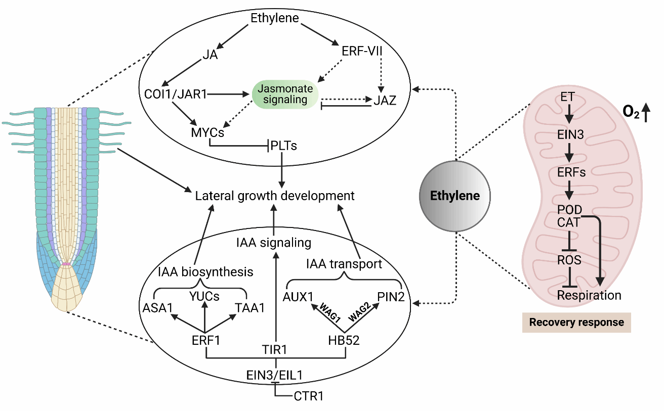 在根系构建中,ET通过调整生长素运输载体的分布来引导IAA流,进而通过ARF/LBD等转录因子执行侧根发育程序。