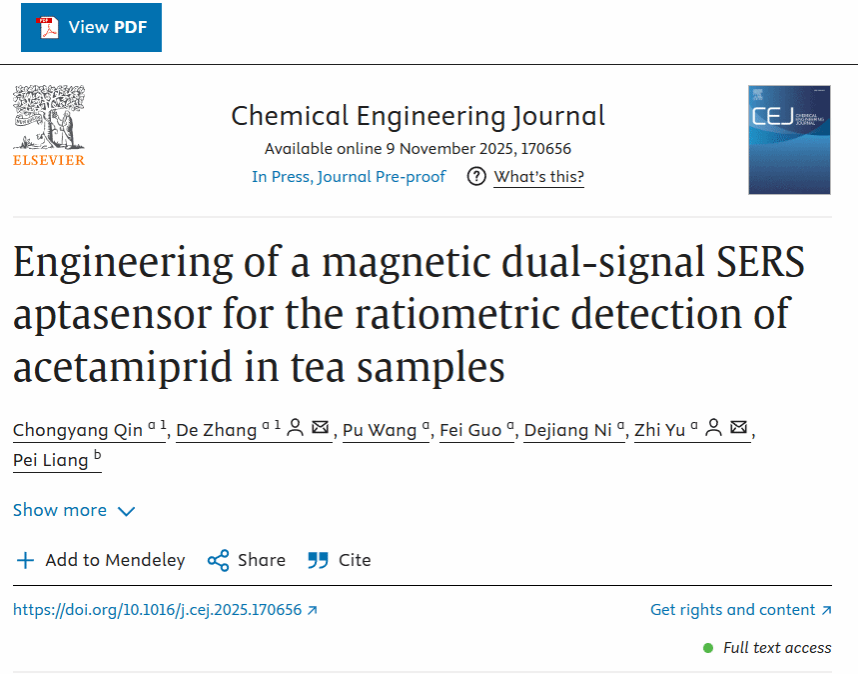 近日,澳门十大网投正规官网平台、果蔬园艺作物种质创新与利用全国重点实验室倪德江教授团队张德副研究员和余志副教授在国际学术期刊Chemical Engineering Journal上在线发表了题为“Engineering of a magnetic dual-signal SERS aptasensor for the ratiometric detection of acetamiprid in tea samples”的研究论文。本研究提出了一种可以在茶叶复杂基质中高效磁性富集、快速、特异性检测啶茶叶中虫脒农药残留的有效策略,为保障茶叶质量安全奠定了研究基础。