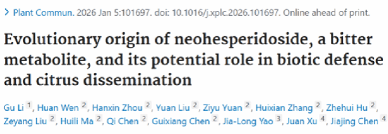 近日,澳门十大网投正规官网平台柑橘品质生物学与调控团队在Plant Communications发表了题为“Evolutionary origin of neohesperidoside, a bitter metabolite, and its potential role in biotic defense and citrus dissemination”的研究论文。该研究系统追溯了芸香科柑橘亚科植物中特征风味与生物活性物质类黄酮新橘皮糖苷类物质(Neohesperidoside,Neo)的生物合成通路关键基因分化导致其前苦味表型(区别于柠檬苦素诱发的延迟苦味)起源、形成和演化的历史脉络,发现其在适于药用与食用柑橘的种质中呈现截然不同的驯化模式。同时,研究还揭示了Neo在柑橘亚科植物抵御生物胁迫及地理分布扩张中的重要作用。