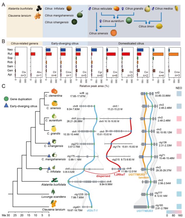 基于广泛靶向代谢组学分析发现,类黄酮新橘皮糖苷(Neohesperidoside,Neo)在柑橘近缘属中尚未出现,而是从枳、宜昌橙等早期分化柑橘种中开始特异性积累。结合系统发育分析与规模化酶功能验证,研究锁定了两对与Neo生物合成相关的关键基因。进一步通过比较基因组学分析揭示了该性状的分子起源机制:在早期分化柑橘(枳)中,二葡萄糖苷转移酶的两个祖先基因dGlcT-1和UGT79B203分别发生散在复制(dispersed)与串联复制(tandem),并伴随新功能化(糖供体特异性由葡萄糖转变为鼠李糖),各自演化出催化Neo合成的关键基因Cm1,2RhaT和UGT79B202,从而赋予柑橘属物种合成前苦味决定物质Neo的能力。